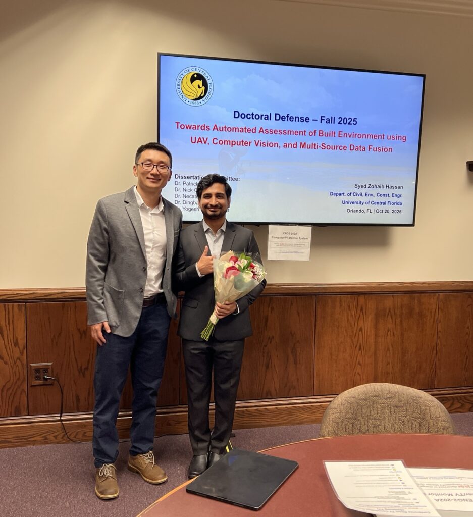 We’re thrilled to announce that Syed Zohaib Hassan has successfully defended his Ph.D. dissertation in Civil Enginerring at the University of Central Florida. His research focused on developing automated, data-driven solutions for monitoring the built and natural environment, contributing valuable insights to the field of civil engineering, remote sensing, and artificial intelligence. Way to go, Zohaib! 👏